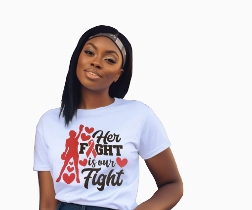 This product, the Her Fight Is Our Fight T-Shirt, is designed to raise awareness for cancer. Join the fight and show your support with this impactful t-shirt.